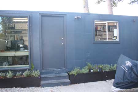 The spacious backyard is blanketed with thousands of pebbles instead of water-thirsty grass, and serves as the location for a small home office made from a refurbished metal shipping container that once sat at the Port of Oakland.