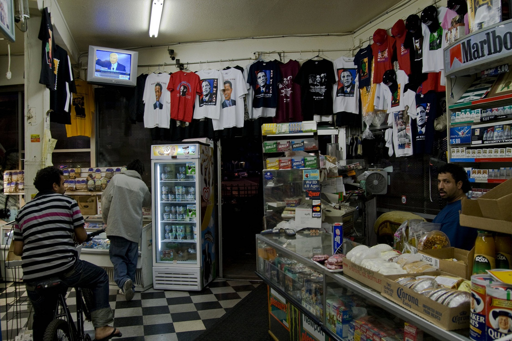 At J&B Fine Foods, a convenience store run by a family of Yemeni immigrants at the corner of Adeline and Harmon Streets, Faiz Kaid is trying to watch the debate on a small television suspended from the ceiling of the store. The shop sells Obama gear because “it’s good business,” he says, but the brothers who run the store were Clinton supporters.