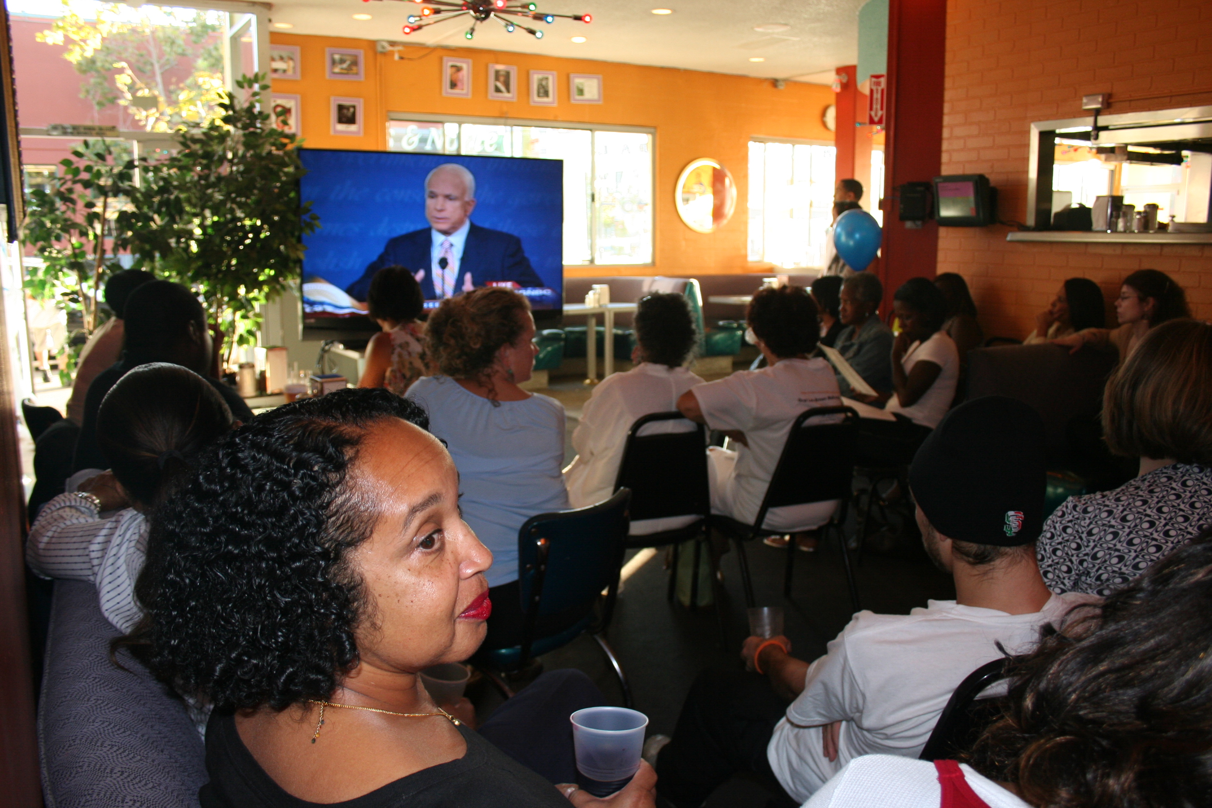 Lorena Terrell arrives early to nab a front-row seat to watch the debate. The 62-year-old retired Oakland resident gazes with rapt attention at Obama, a man she wants to be “our truly first black president.”