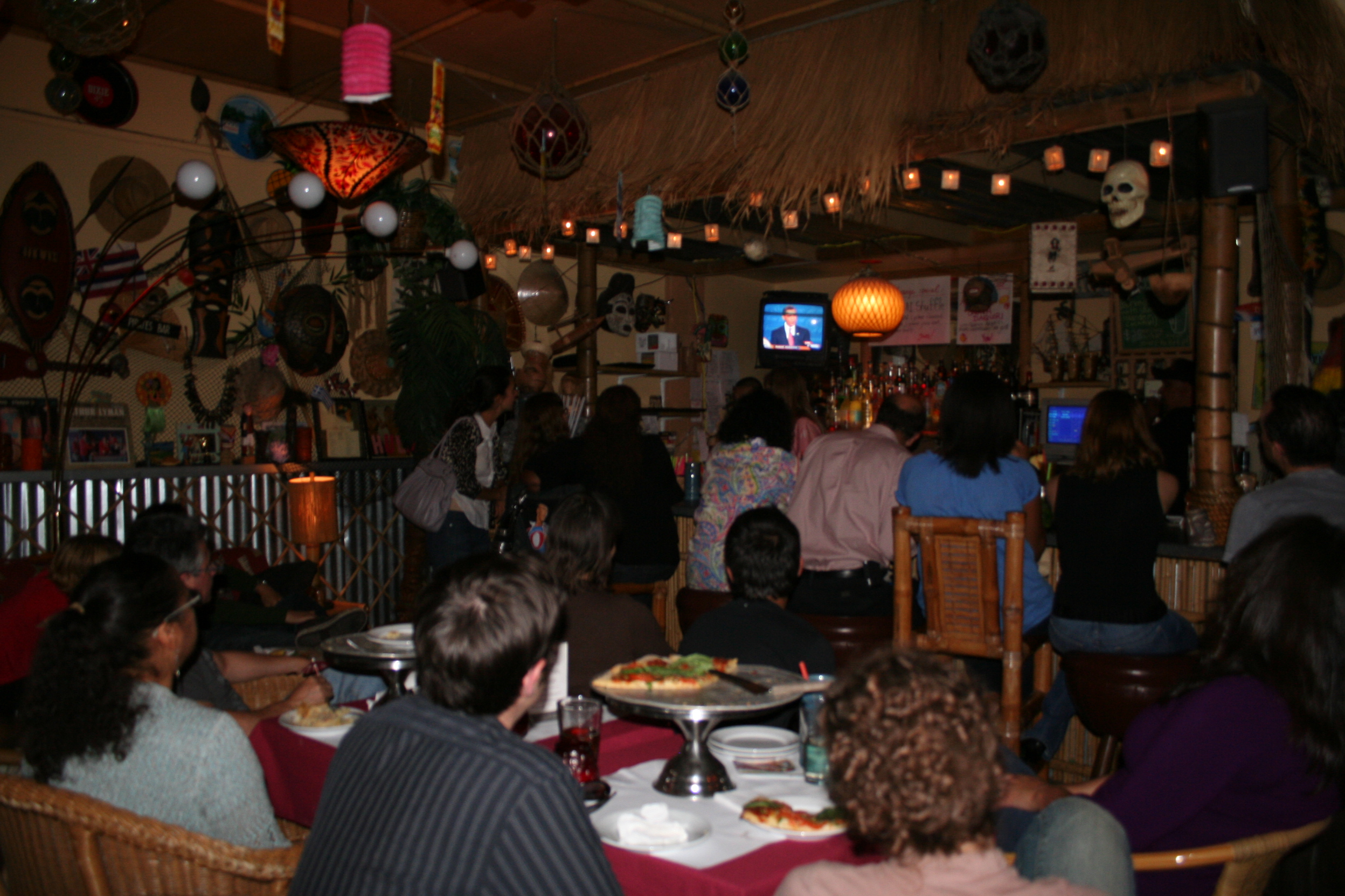 At the Conga Lounge on College Avenue, owner Emmanuel Thanos passes around a tin bucket asking for $1 minimum donations to the Obama campaign. It’s a tight space, with about 75 people straining to watch a tiny 13-inch television tucked behind the bar in the dimly lit, tropical-themed lounge.