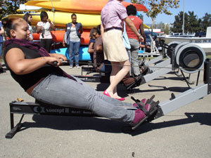 - A veteran team member shows a prospective team member how to row on the ergometer.