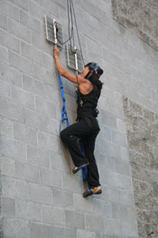 A rousing cheer burst forth from a dirt-covered lot in downtown Oakland this afternoon as “Gecko Girl” – a.k.a. Lyn Verinsky, an amateur rock climber and general manager of Oakland’s Great Western Power Company climbing school – became the first person ever to scale a smooth, vertical wall using technology that mimics none other than a wily lizard.