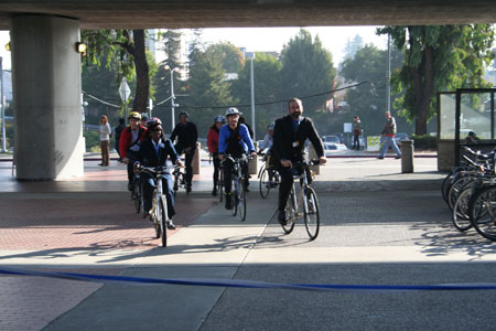Oct. 29–With grandeur befitting the opening ceremony of the Tour de France, BART officials and employees staged a decorous introduction to the new BikeLink Bicycle Locker System this morning near the front entrance of the MacArthur BART station. With the new system, bicyclists can now store their bikes and gear in large lockers at various BART locations in the East Bay.