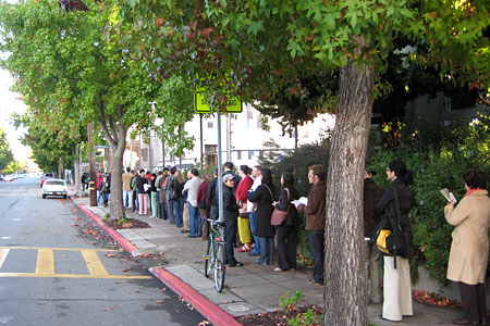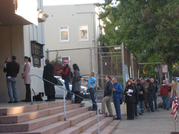 It was an orderly start to an election day morning that follows unprecedented voter turnout–even before the polls opened today. At the Alameda County Registrar’s office, for example, spokesman Guy Ashley said that when he came to work Monday, he saw a stretch of about 100 early voters circling the building, waiting to cast their vote. Reaching the head of the line to cast a ballot Monday took an hour, Ashley said. It was barely 8 a.m, and the lines had been continuous all week.