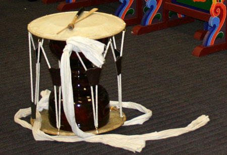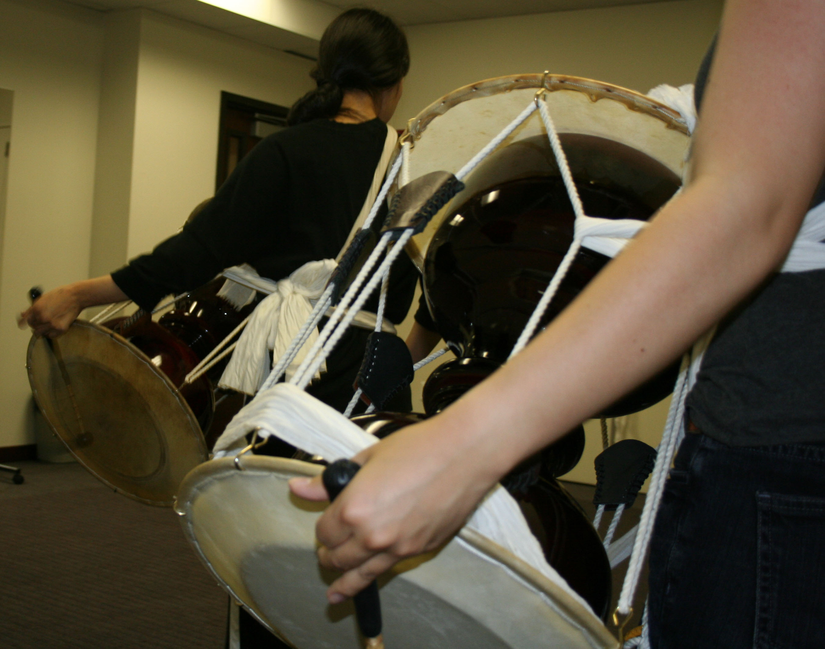 Ten minutes later, Kim is back in action, tying the cloth straps of her jangoo – or hourglass drum – behind her back allowing her to strike the drum on both sides. Jangoo drums, with surfaces made out of cows’ skin stretched taut on the top and bottom, are connected by an hourglass-shaped piece of poplar wood carved hollow in the middle. The top and bottom surfaces are tied together by white ropes at several points along its circumference. Drummers can tighten or loosen the ropes depending on how resonant a sound he or she wants to achieve.