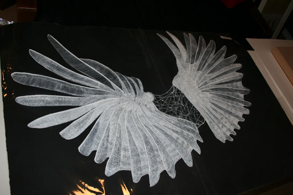 But exposure does not happen on its own. Back in the living room, Maxwell brings out a booklet of her latest collection of work, up-close portraits of wings inspired both by animals and her imagination. Each intricate part of a feather has been painstakingly rendered, sometimes dozens of times over, to create a single airborne limb. Some pieces took months to complete. Now it’s time to get them out there. She’s sending her booklets to galleries, hoping they will showcase her latest creations as a one or two-person exhibition. The booklets cost $13 each to produce, Maxwell says, but she’s learned to invest in herself. “Marketing should be half of your time, and it’s the worst part,” Maxwell says. “I could work in my studio all day if I could but it doesn’t work that way.”