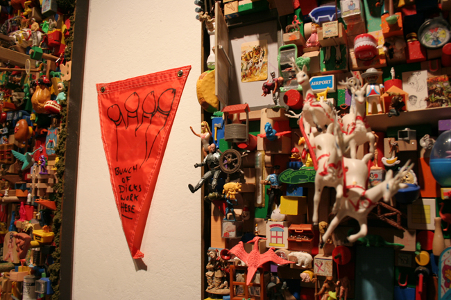The experience starts innocently enough with two colleges of plastic action figure toys arranged in two large rectangles. Between the toy collages is an orange flag with a warning, “A bunch of dicks work here.” I surveyed the pen strokes above the words for a few beats and realized it was something more than that.