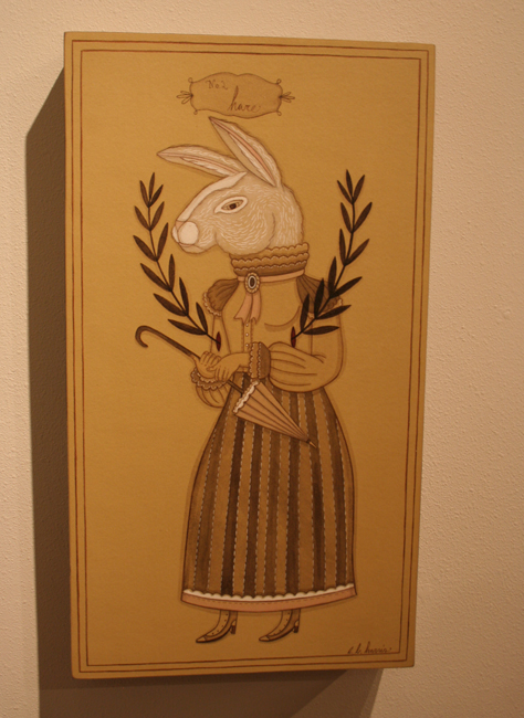 I swam through the crowd to enter Johanson Projects and was immediately enchanted by the whimsical world Evan B. Harris’ created in Collections & Curiosities. Harris’ subjects are anthropomorphic critters dressed in steampunk fashions, which is clothing influenced by the Victorian Age.