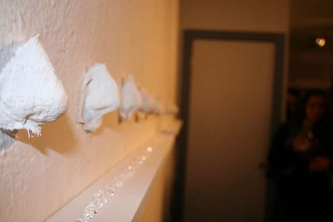 Next door to Mama Buzz was a mixed media show of paintings and installations from four artists with one name. The pieces that caught my eye were “Uh Oh Fame” by Erica. In it, a demonic Angelina Jolie casts bolts of red tendrils from her ever-wandering eyes. The other was Cocaine Introvert, a series of nose castings hovering over a line of crystal coke nuggets. Dimitri said the work was inspired by experiences he had living with roommates who were addicts.