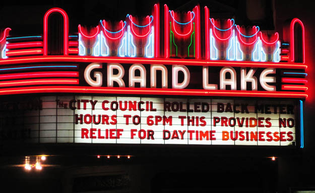 Just past the intersection of Grand Avenue and Lake Park at 6:30 PM, car after car glided down the street and the occasional driver slowed to troll for parking. The meters had expired and the free parking spots were full of gleaming vehicles reflecting the neon lights of the marquee over the Grand Lake Theater. The glowing sign displayed a full slate of movies, alongside the latest pointed message to the city council about the parking controversy that has been felt so strongly in this neighborhood.