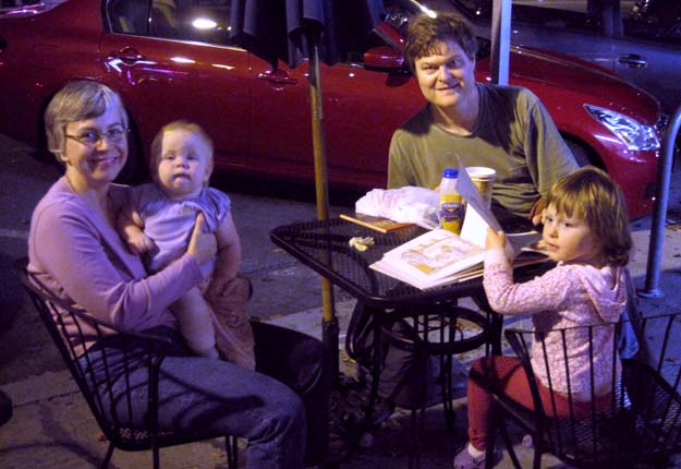 Neighborhood residents Francis Upton and Martha Lyman were sitting at a table outside Café DiBartolo with their two kids, one-year-old Ona and three-year-old Leah. When Upton and Lyman heard about the event, they made plans to come have coffee and browse at the bookshop next door.