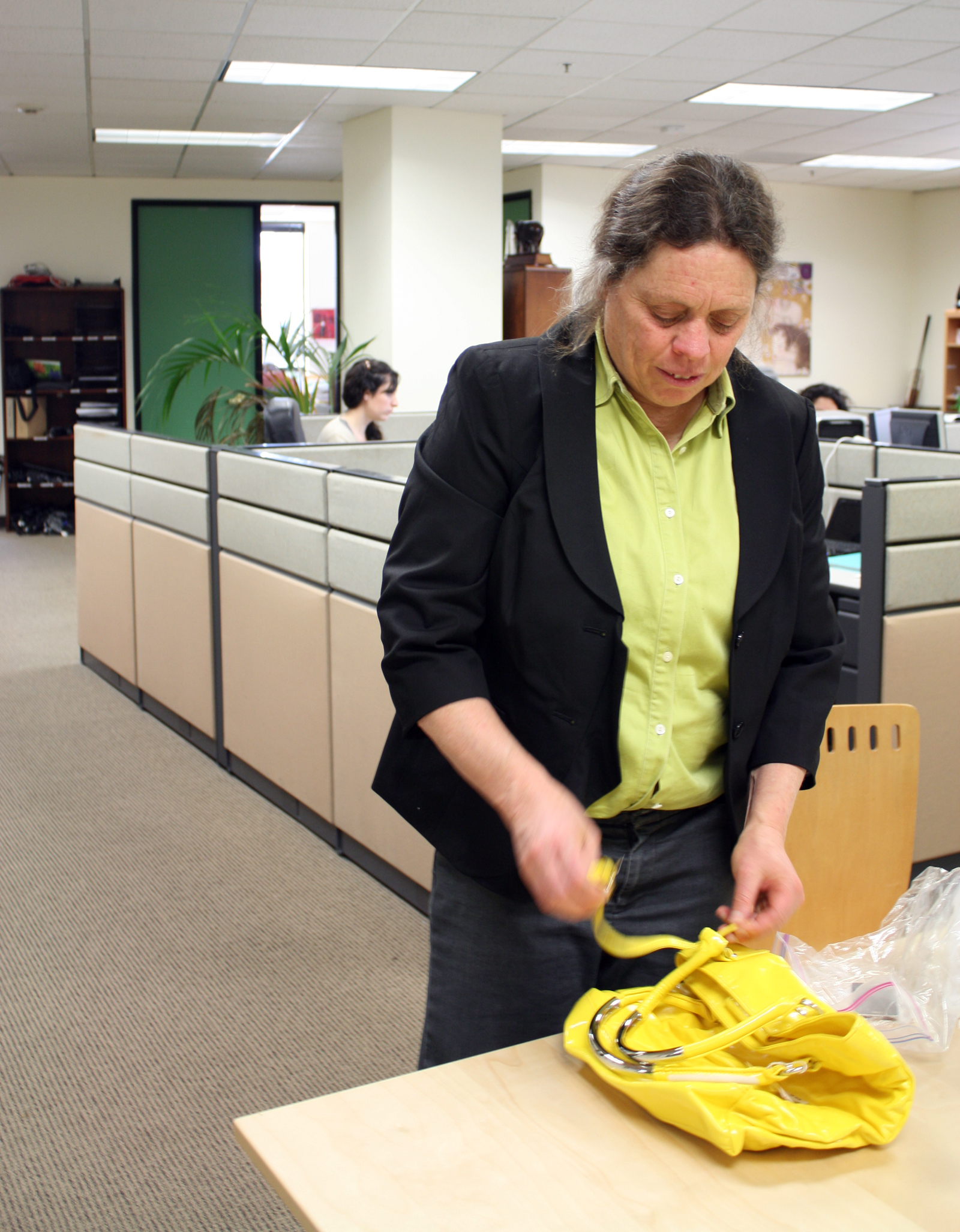 - Caroline Cox removes a zipper pull from a yellow purse so that she can test it for lead using the Center For Environmental Health’s equipment.
