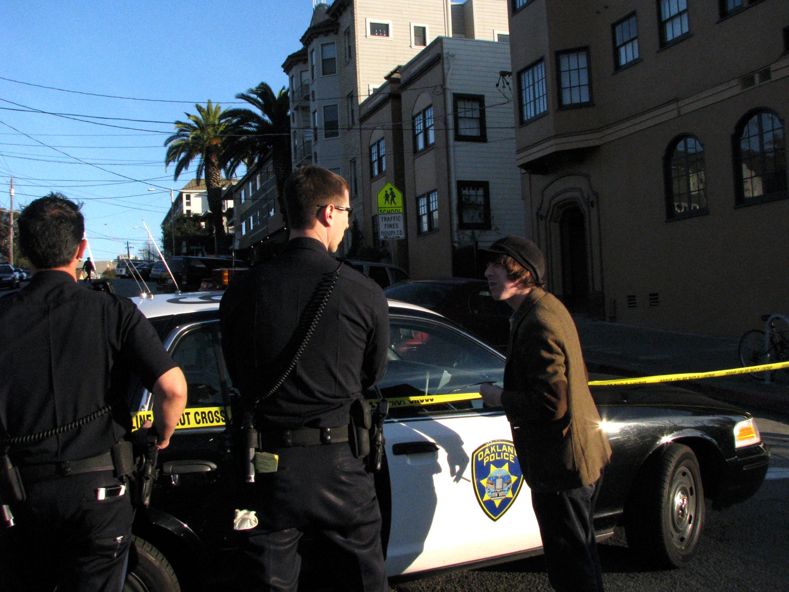 - Oakland and Livermore police officers searching for a bank robber check the alleyway near an apartment building before deeming it safe for residents to enter.