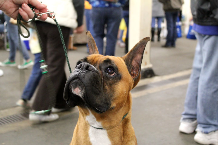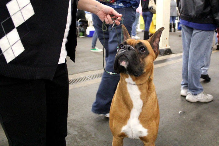 The lone Boxer, a 17-month-old male, was named Forest—or more formally, Gingerbread Black Forest Tradition. He was a rich tan, the color of caramel, with a solid white patch on his chest. He had an air of confidence, and stood quietly next to his handler, sticking his chest out like royalty. He was not distracted by the consistent string of dogs marching by.