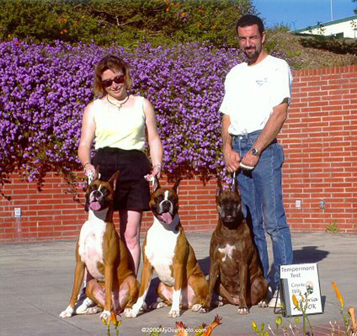 - Christina Ghimenti and her husband of almost 20 years, pose with three of their Boxers at the American Temperament Test, in July 2000. Dogs from left: Penny, Booker T, and Crystal. Photo courtesy of Christina Ghimenti and PawPrintBoxers.com