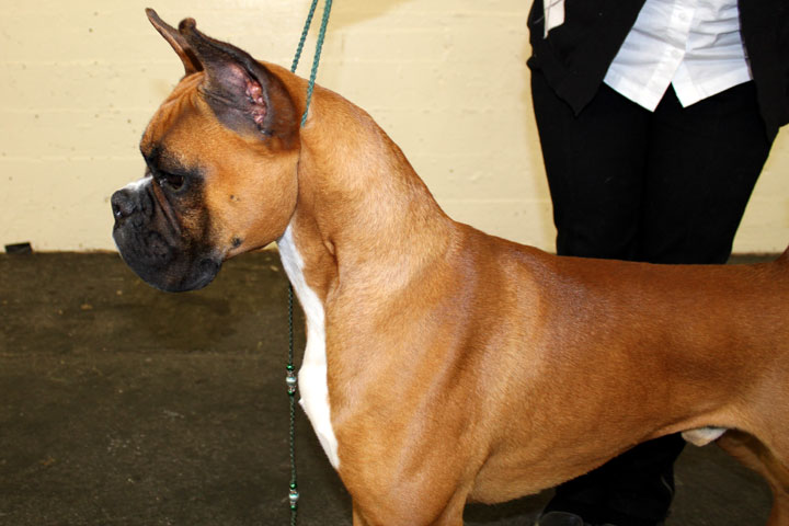 But despite Forest’s good performance, after all four dogs were thoroughly examined the Best of Breed prize went to a fawn Boxer named GCH Conquest-Rosend’s New Kid In Town, better known as Riley. Riley is only 16 months old, younger than Forest, and already a Grand Champion. Forest has been competing for 10 months; Riley has only been competing for six.
