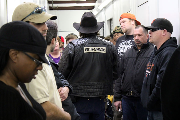 Auctioneer Forrest O’Brien (center) arrived at PayLess Self Storage in a black leather Harley Davidson jacket, black Ray Ban Sunglasses and a dark brown cowboy hat with toothpicks stuck in the brim. O’Brien’s tan leather wallet sticks out of his back pocket, attached to his crisp dark jeans with a gold chain. His handlebar mustache is neatly groomed and his long hair just barely peeks out from beneath his hat. Worn-in brown leather cowboy boots complete the look.
