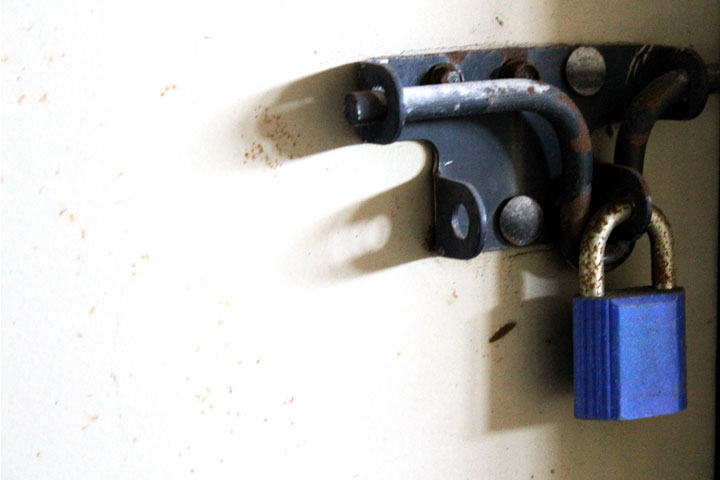 The crowd follows Butler a few feet across the main driveway of the facility and into a narrow walkway. Only about three feet across, the walkway is lined on either side with what look like small garage doors. Each door is a separate storage unit. The lock of the first unit on the right is cut and the door pulled up.