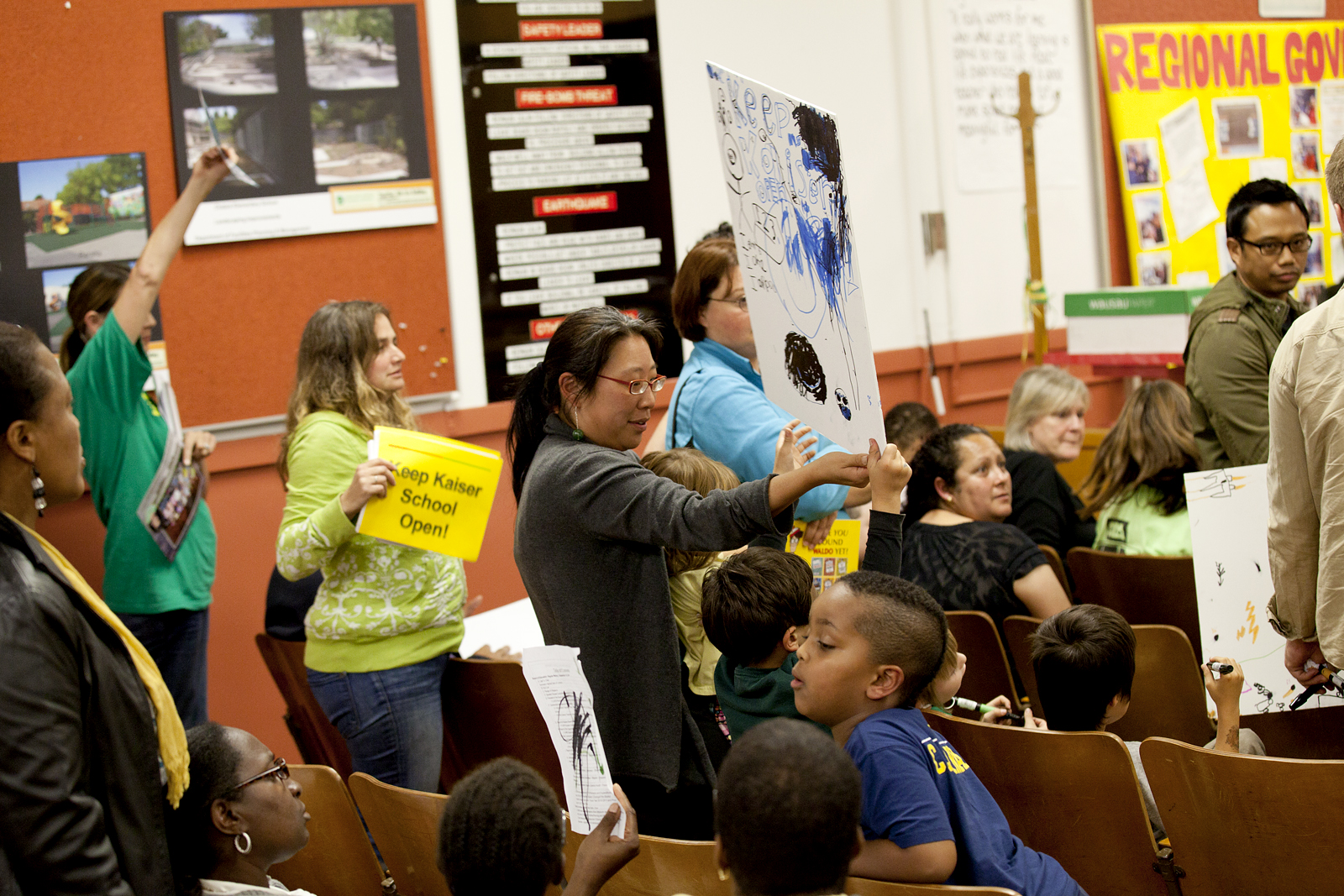 Concerned parents, children and community members packed the Oakland Unified School District board meeting Wednesday night, clutching protest signs opposing the district’s possible closure of as many as ten elementary and middle schools. So many people showed up for the meeting that latecomers were led to a fourth-floor overflow room, where they watched a live telecast of the meeting.
