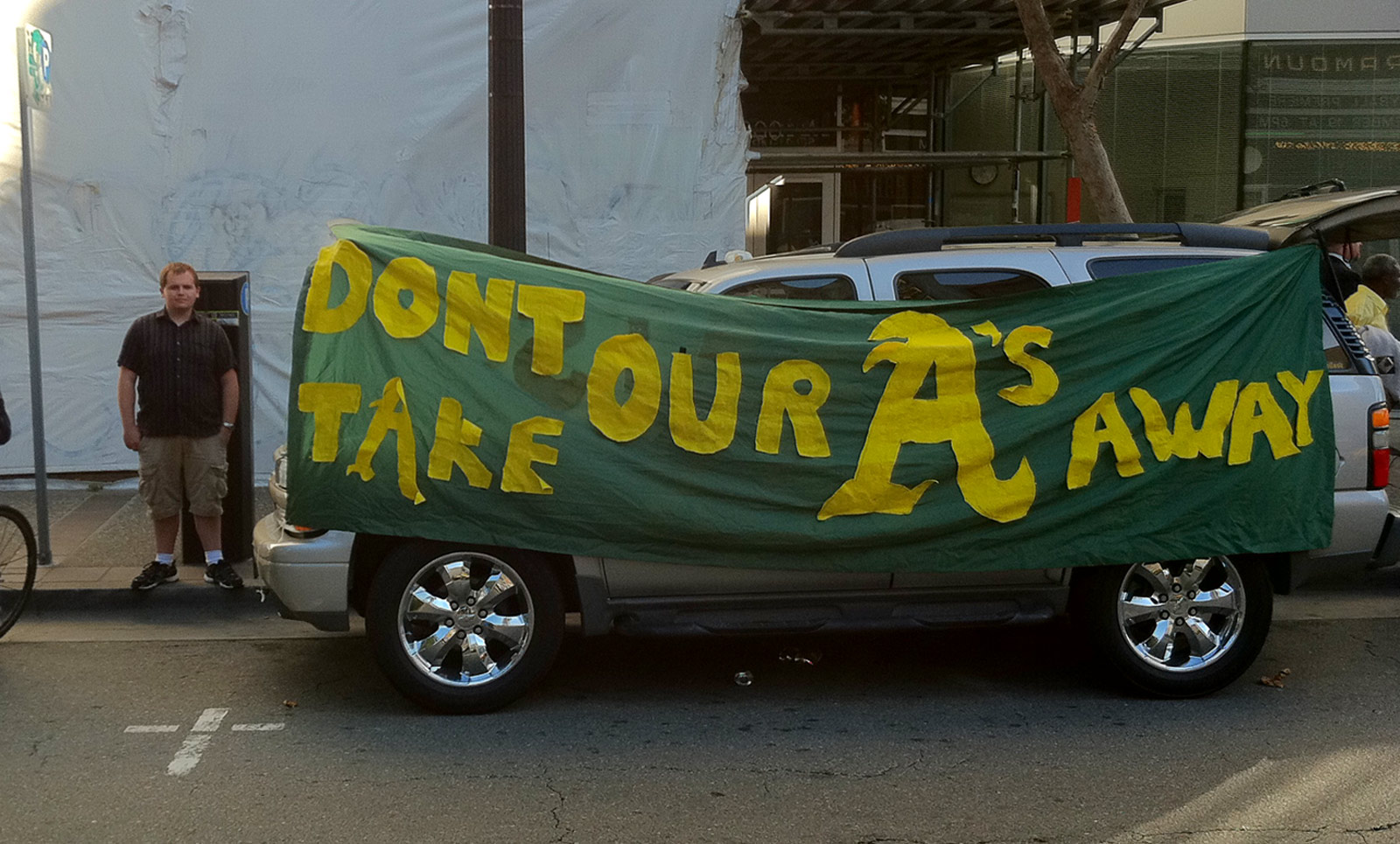 Competing with the occasional cheers coming from the celebrity sighters around the corner, Caminada and has buddies alternated chants of “Let’s Go A’s!” with “Keep the A’s in Oakland!” Caminada, like many others in the crowd, had attended numerous all-night filming sessions at the Coliseum months earlier, playing extras.