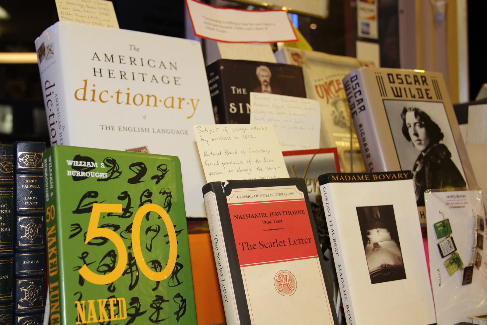 This year, Pegasus has set up a banned book display at the right of the entrance door. Each displayed book features a customized bookmark with a quote or review explaining why it was removed from a library shelf or challenged in different communities.