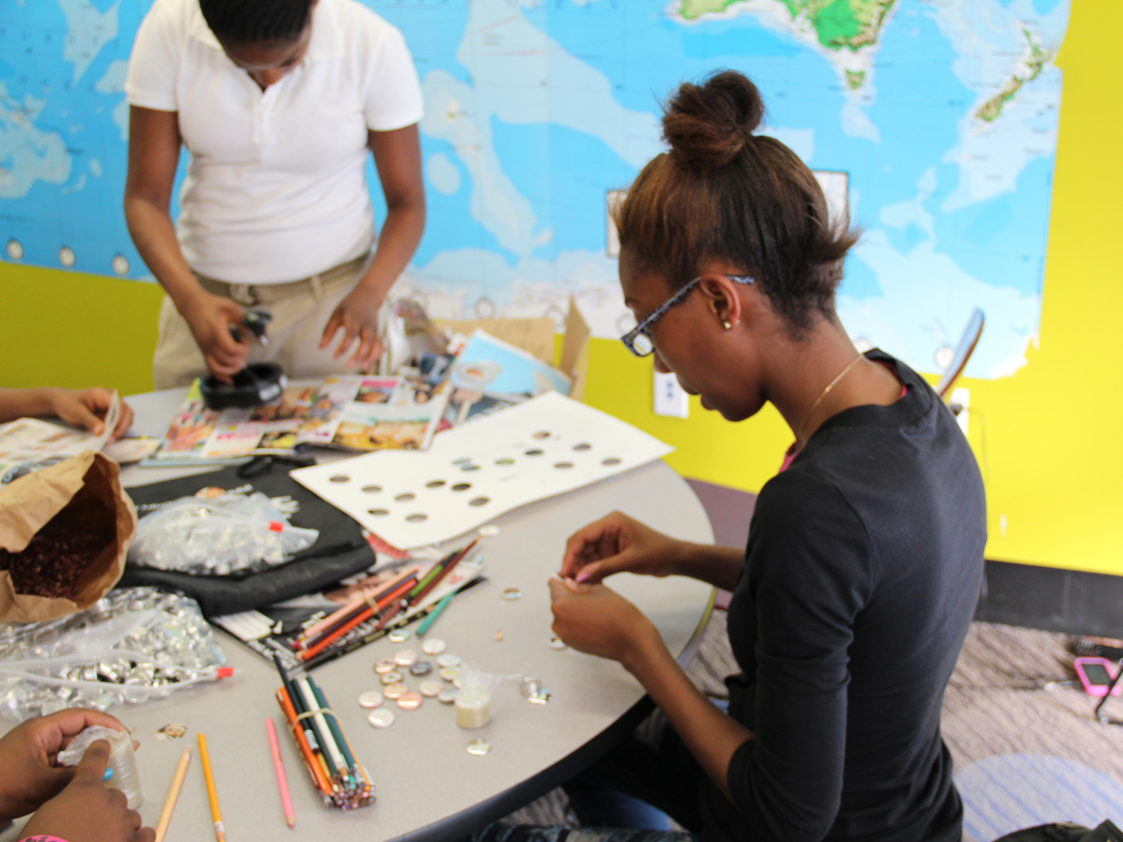 Jonasha McCoy, 17, an 11th grader at Oakland High School, makes finishing touches on her custom-made button pin.