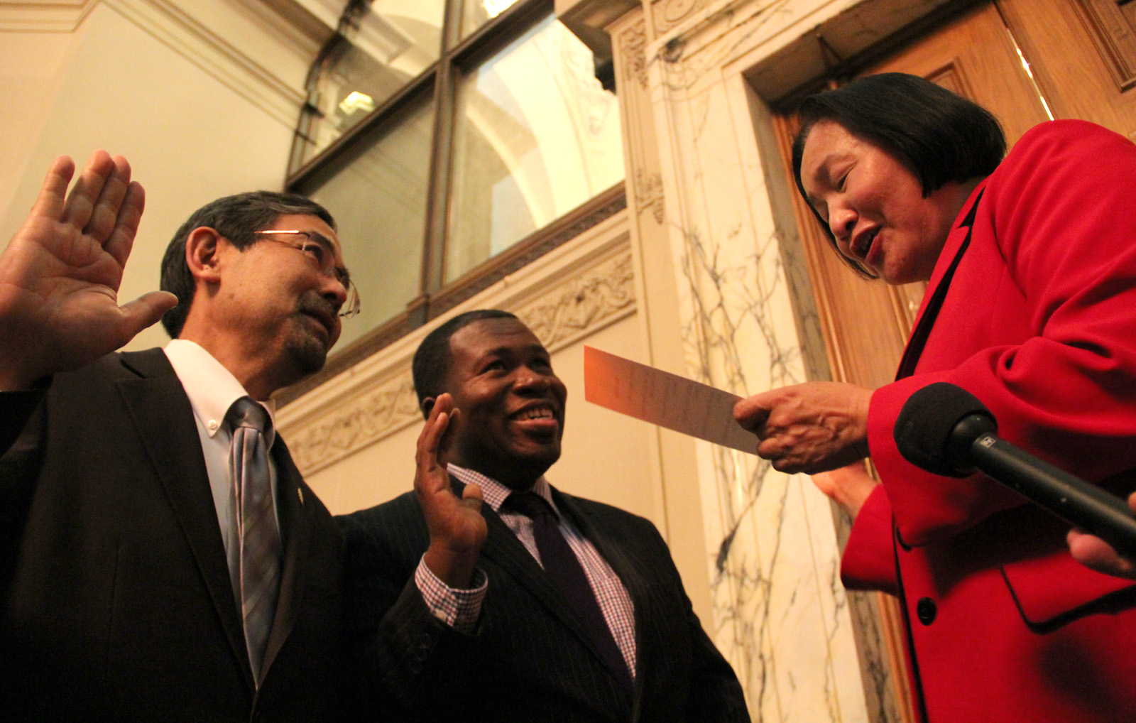 Mayor Jean Quan swears in Victor Uno and Jakada Imani as port commissioners outside the city council chambers. Photo by Megan Molteni