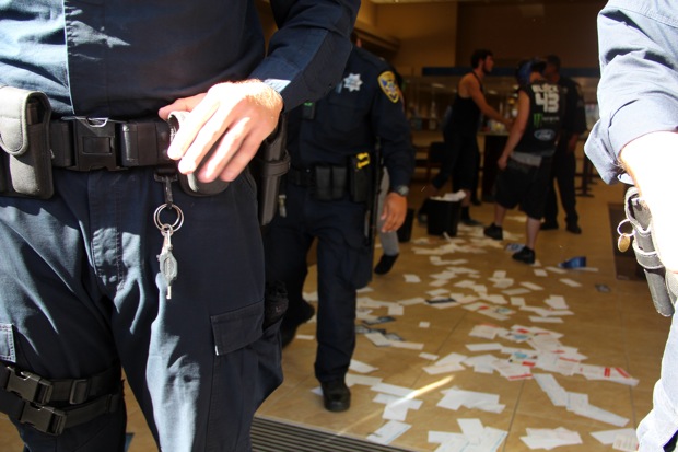 By midafternoon, the protest march was still continuing through the streets of downtown Oakland, with the crowd heading back to the tent city at Frank Ogawa Plaza. Some protesters stopped at Chase Bank on Lakeshore Drive and ripped up deposit slips before police barricaded the doors.