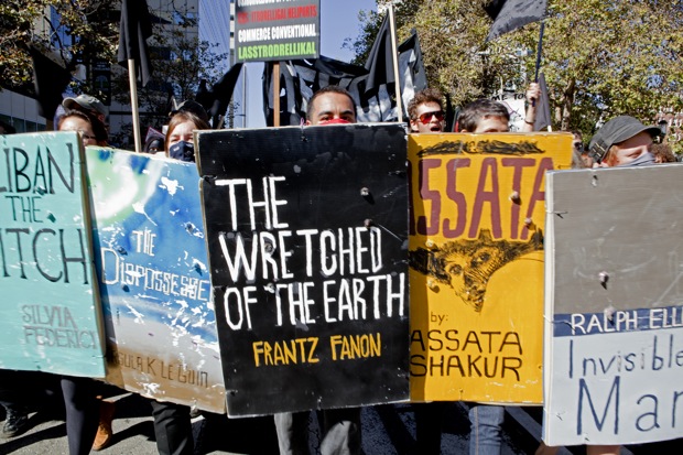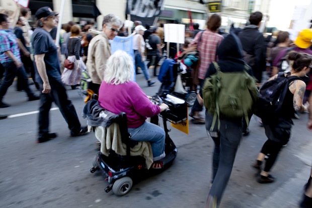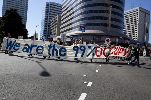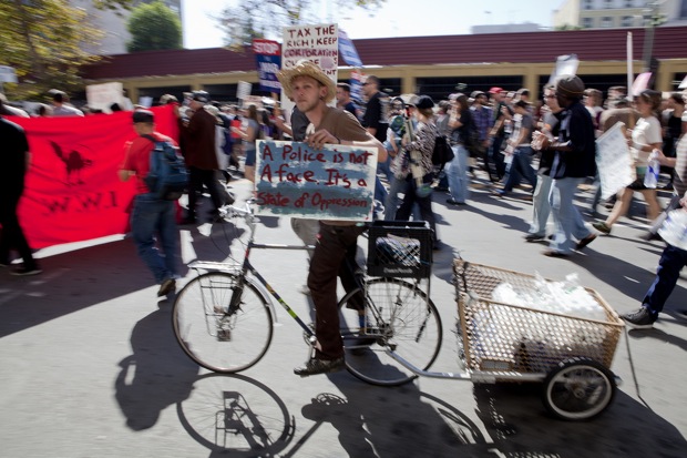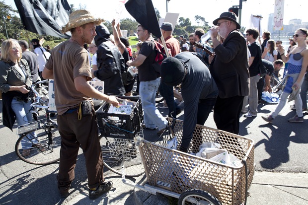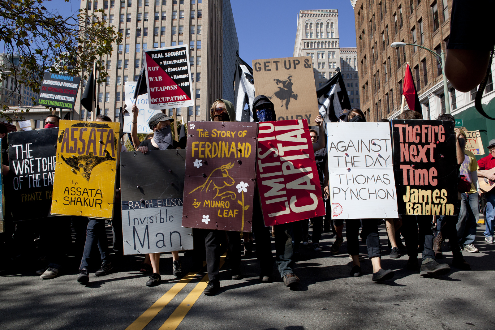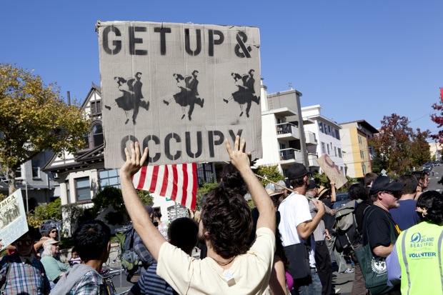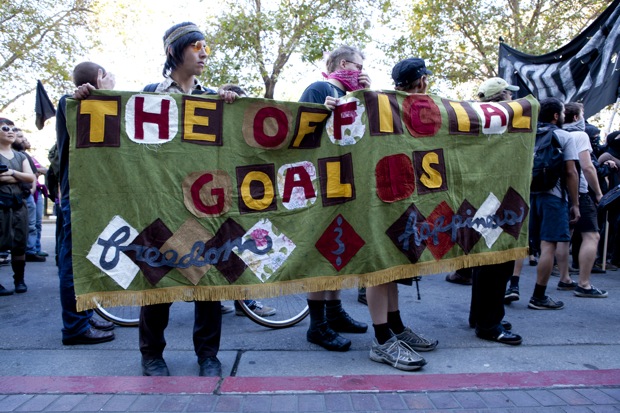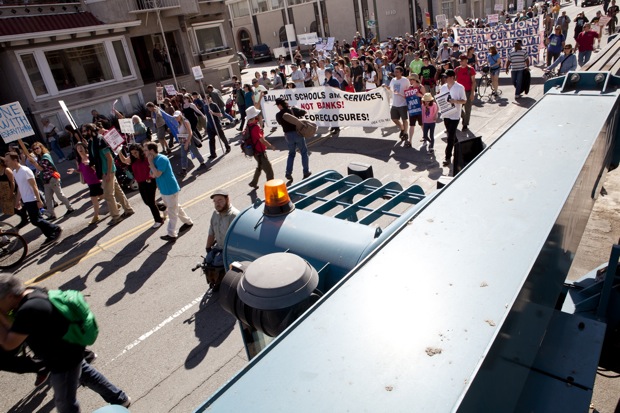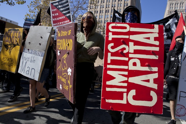The crowd appeared to Oakland North reporters to number about 700 protesters, dozens of them carrying signs with inscriptions like “Tax Wall Street,” as well as black flags and a large sign that read “Revolt for a life worth living.”