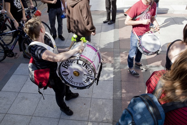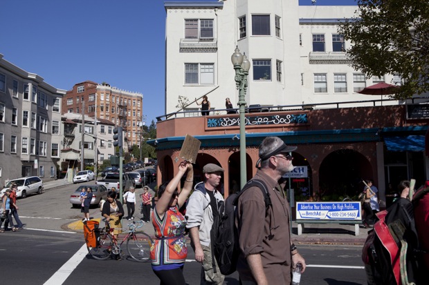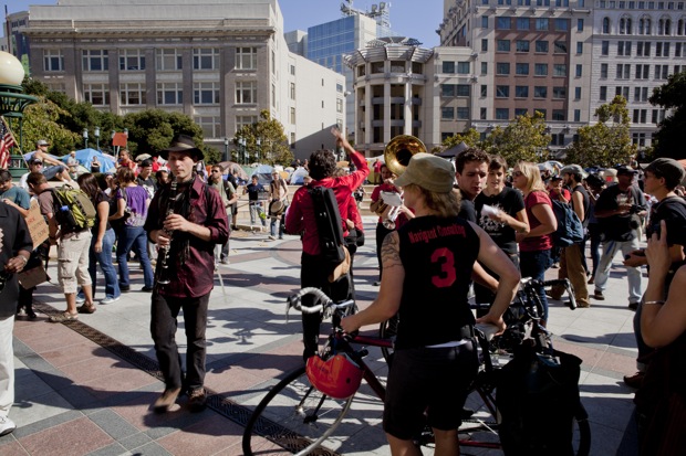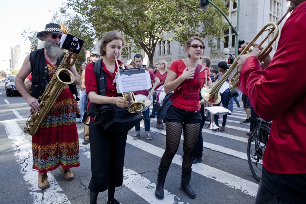 The march began at Frank Ogawa Plaza, where protesters have been camping out since October 11 in protest of economic inequality and the federal bailout of Wall Street banks. Marchers continued down 14th Street, then along Harrison and by Lake Merritt, before pausing in front of the Grand Lake Farmer’s Market. A group of people playing brass instruments played as people danced, passerbyers stopped to gawk, and customers in businesses and restaurants along the march route stopped what they were doing to see where the noise was coming from.