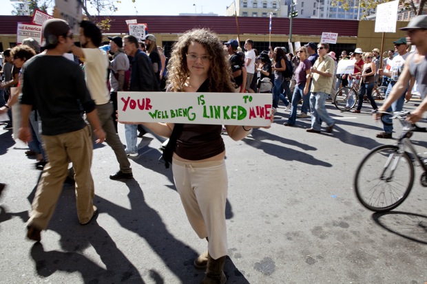 “I’m here because of economic injustice in the whole American system,” said a 23 year-old St. Mary’s College student named Connor, who declined to give his last name and was carrying a sign that read “$20,000 in student loans, 0 job prospects.”