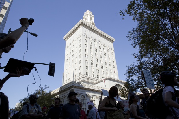 The march concluded at about 3:30 p.m. back at Frank Ogawa Plaza, where Saturday marked the 12th straight day of ongoing demonstrations in front of City Hall. On Thursday, the estimated 550 people camped out the plaza received an evacuation notice from the City Administrator’s Office. But no action to remove the protesters had been taken by Saturday afternoon. While the march was underway, a crowd of a few dozen remained at the tent city, playing music and talking to one another without much of a visible police presence.