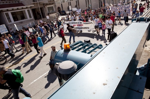- Protesters shouted a variety of chants as they walked such as “Banks got bailed out, we got sold out!”