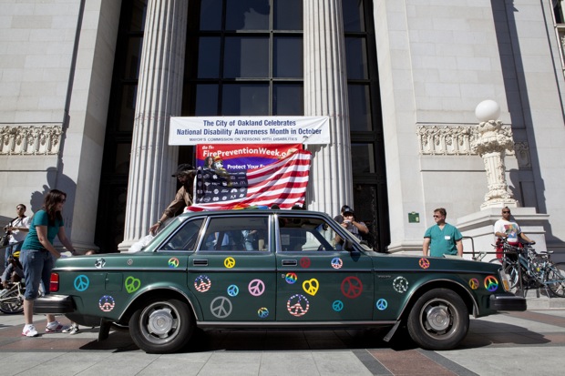The march followed a City Hall steps rally that featured more than two dozen speakers, including National Nurses United union representatives and retired teachers. Two Oakland police cars drove ahead of the crowd, halting traffic in both directions, as the marchers crossed Broadway, chanting, “Every hour, every day, the occupation is here to stay!” and “Banks got bailed out, we got sold out!”