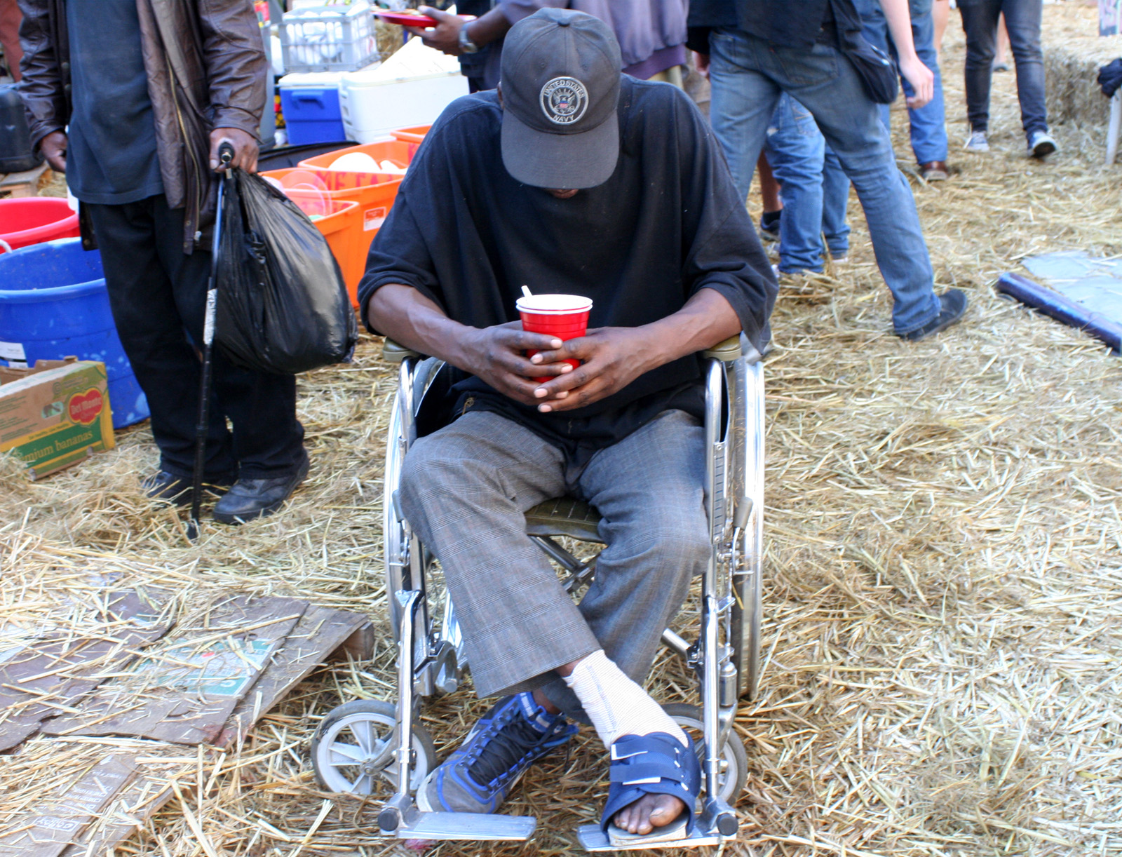 Gregory Henderson comes to the camp for free meals and medical care. He is temporarily in a wheelchair because of an infected blister on his heel.
