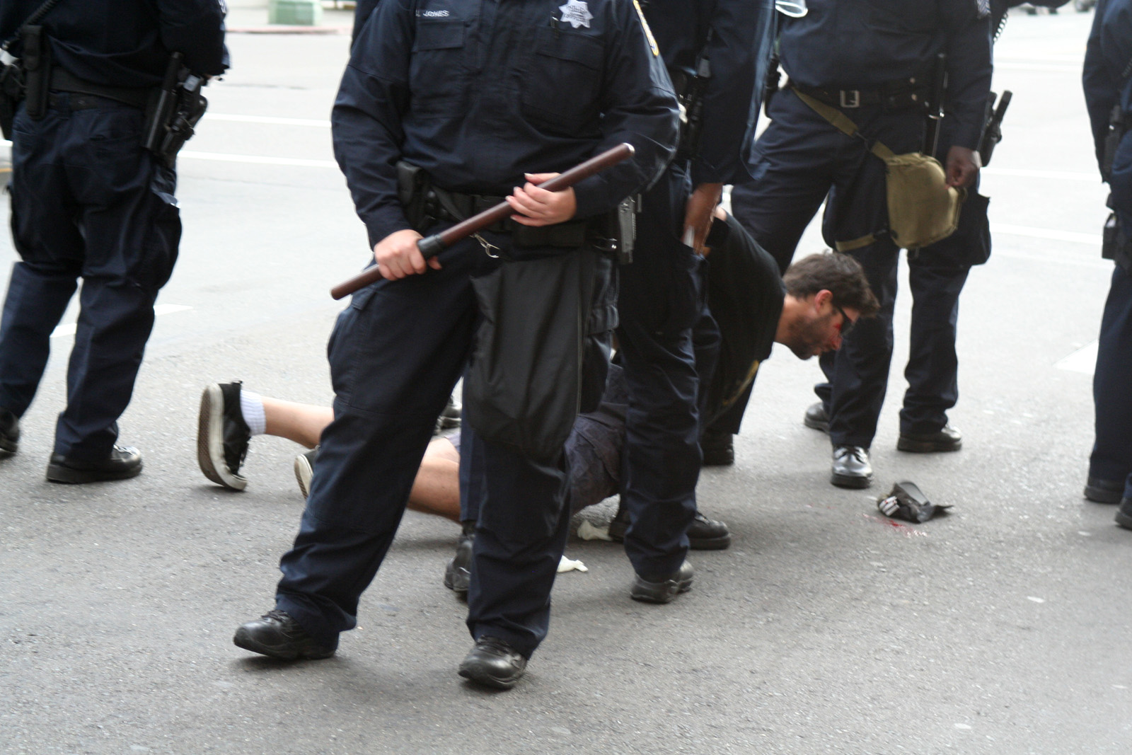 - Police restrain a man on Franklin and 14th Street; his face is bleeding from hitting the ground when police restrained him. Photo by Brittany Schell.