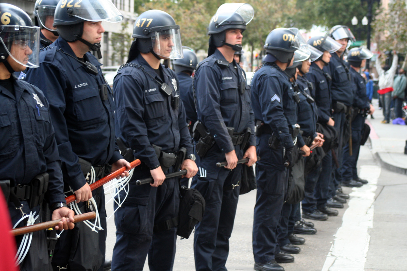 - Police officers in riot gear line the intersection at Broadway and 14th Street, across from Frank H. Ogawa plaza. Photo by Brittany Schell.