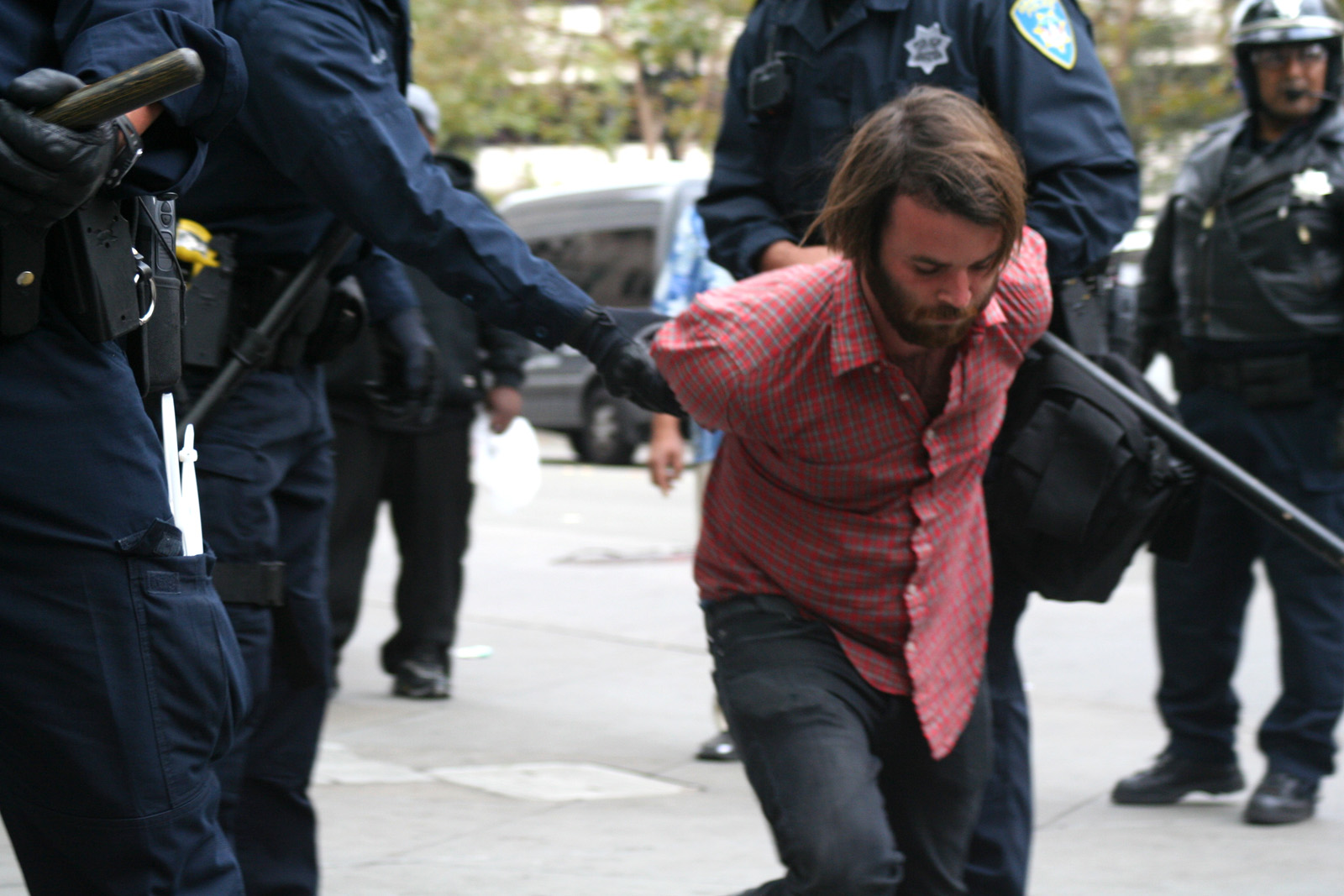 - Oakland police officers restrained and handcuffed a protestor on the corner of Broadway and 14th Street, across the intersection from the plaza where the encampment had existed. Photo by Brittany Schell.