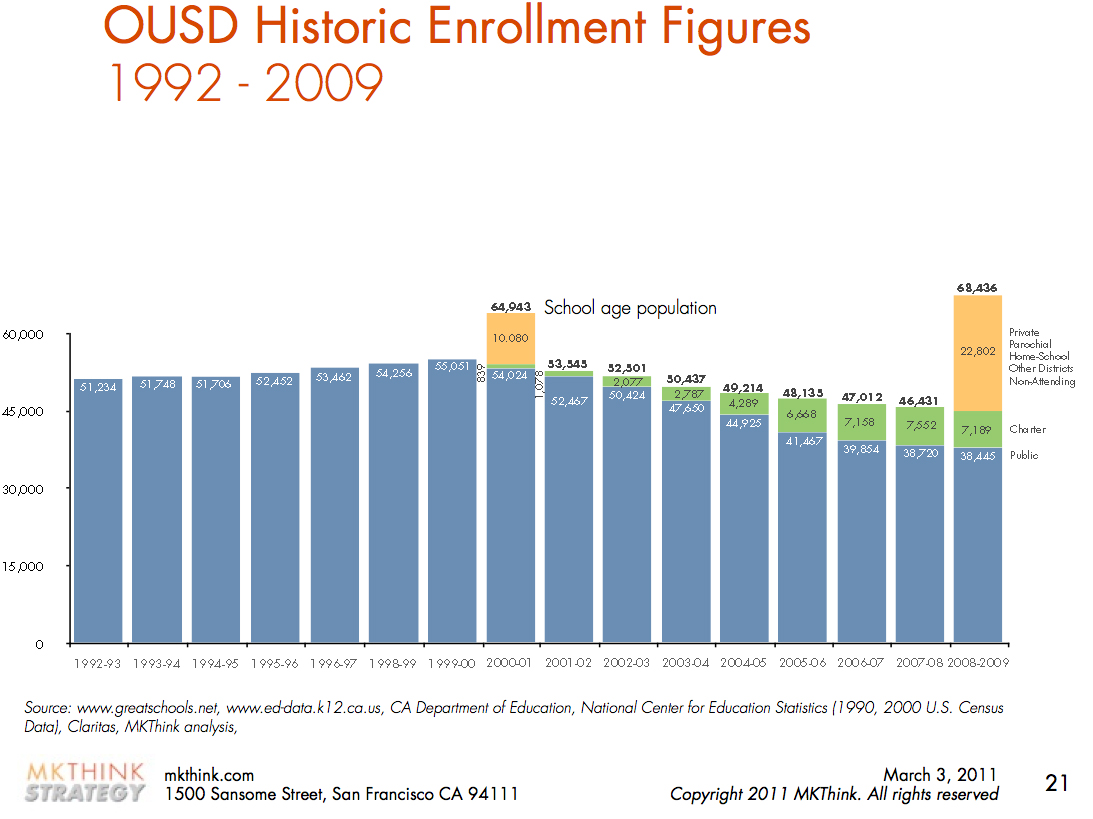 As the chart indicates – thank you for including that – when the small schools movement began in 2000, district enrollment was rising. The small schools were in part a response to severe overcrowding, hard to imagine today. The district has since lost many students to charters and private schools, which is in part a function of the gentrification of Oakland. This was a dramatic, unanticipated change in circumstances. People should know that the small schools have been consistently better than the schools they replaced, even at the high school level, where it hasn’t translated into test score gains. The new small schools were supposed to be given “charter-like” autonomy, but that has always been limited, and thus limited their ability to compete with actual charters (by being able to hire who they want, adjust curriculum, etc). Now as a result, some small schools are voting to turn charter and secede from the district, further exacerbating the problem.