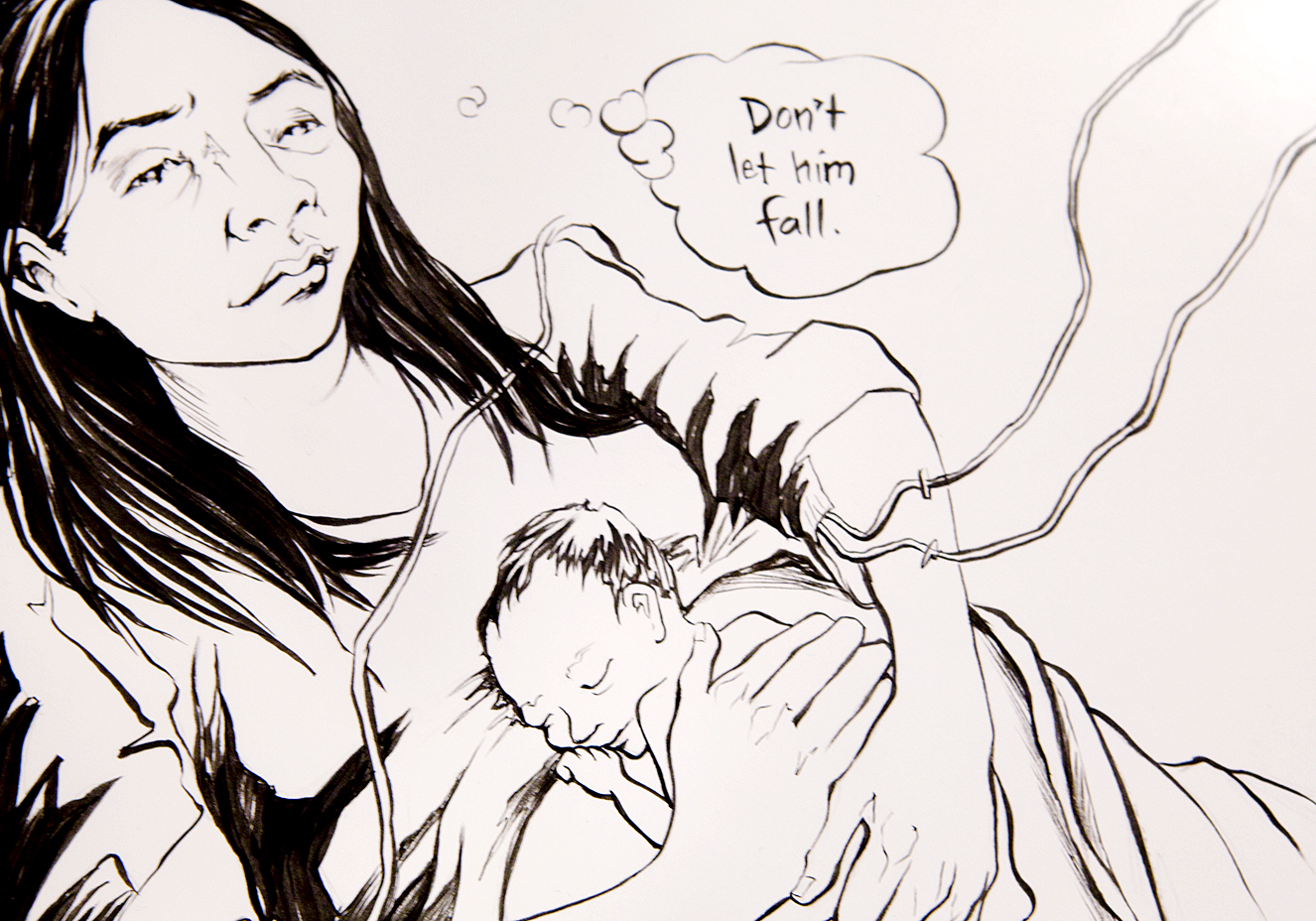 By asking her students to create these comics, Bui is not only teaching them to tell stories through art, but she is helping them make sense of their lives and process what they have gone through. Bui has only reflected on her and her family’s immigration experience as an adult. In fact, she says that creating her first book helped her become an adult, even though she was already a grown woman, and a mother, when she wrote it. The first chapter of her book, titled Labor, provides a detailed account of the birth of her son. Page one features a precise drawing—an aerial view of Bui’s very pregnant belly. The chapter illustrates her difficult labor, weaving in stories about the complicated pregnancies Bui’s mother went through both in Vietnam and en route to the United States. Bui says that having a son made her feel closer to her own parents, realizing how hard it must have been for them to move to a new country with three small children.