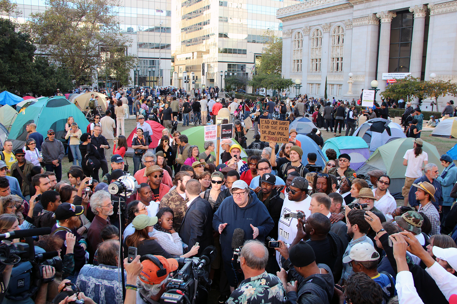 As Mayor Jean Quan finished fielding reporters’ questions Friday afternoon at City Hall about the clash between police and protesters earlier this week, she was suddenly drowned out by cheering coming from Frank Ogawa Plaza for Occupy Oakland’s newest celebrity guest: documentarian and political activist Michael Moore. Moore flew in from New York City to address hundreds of Occupy Oakland supporters, who gathered to hear him speak near the approximately 30 tents that have been raised on the plaza since the raid on Tuesday.