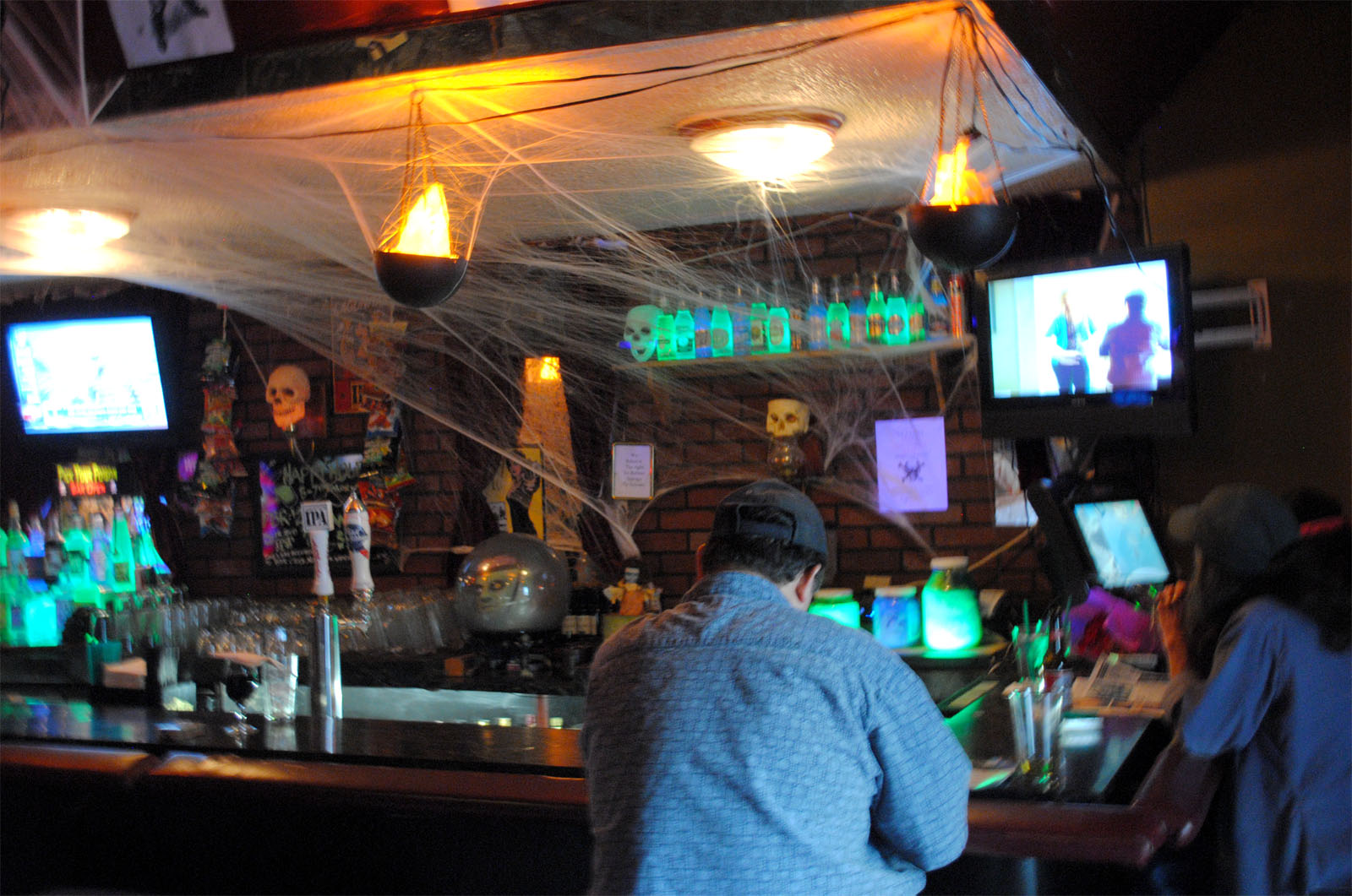 Fake cobwebs cover the place, as well as the sign out front. Plastic chains hang from the ceiling above a pool table, and look real enough that they fooled a customer into thinking they’re really made of metal and could drop on someone’s head at any time.