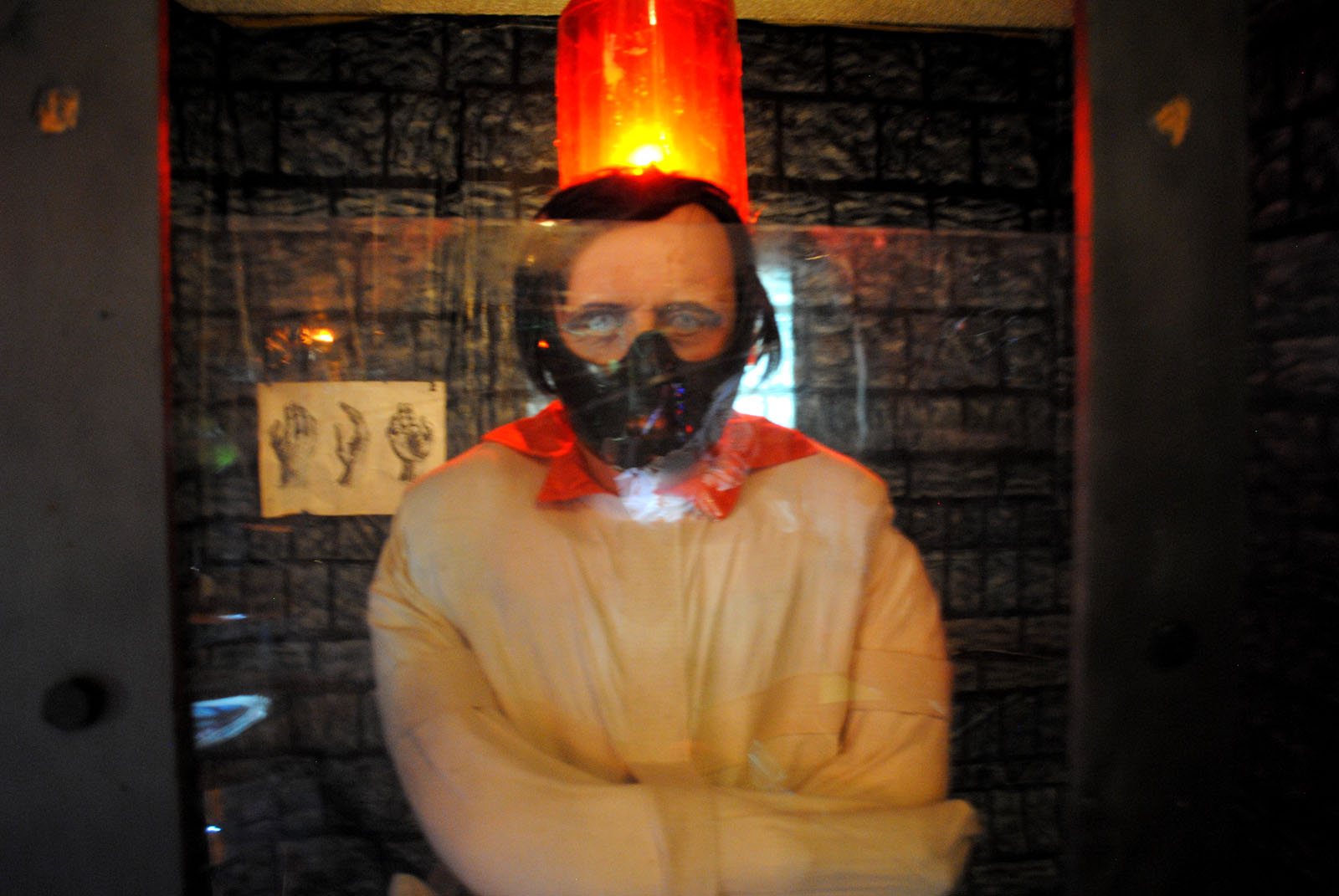 In one corner, there’s a scene from the movie The Exorcist: a creepy bedroom with an even creepier priest, and a girl sitting up in bed whose head spins around and eyes light up when a button is pressed. On the other side of the front entrance is an equally detailed scene from Silence of the Lambs: Hannibal Lecter standing in his jail cell, looking back through a plate of glass.