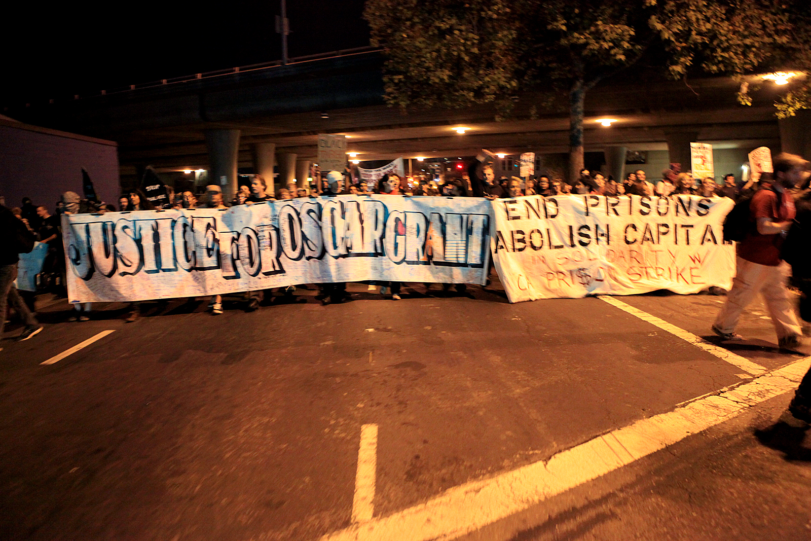 No police presence had been visible, since the march left the downtown area surrounding OPD headquarters, until 10:13pm, when about 35 officers from the California State Highway Patrol were seen stationed at the corner of Brush Street and 18th Street. Suddenly, all of the officers quickly got into their cars and sped down Brush St. toward 14th Street. There they met up with fast-charging marchers.