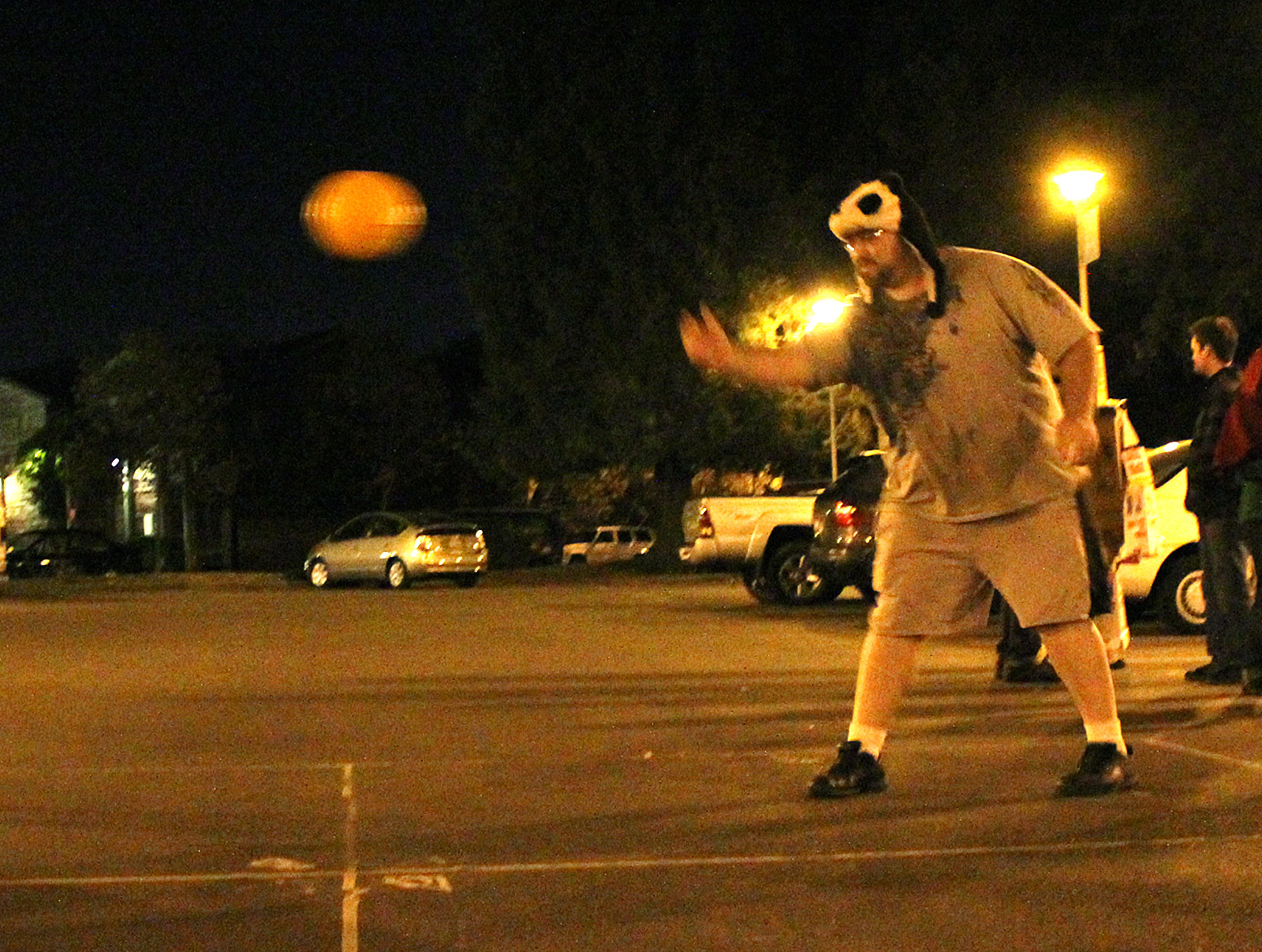 Satisfied the BART officer wasn’t interested in foursquare tonight, samurai Wong finished his slice of pizza, set his half-empty beer can on the ground and made his way to the back of the line—behind a mummy, a rockclimber, and a panda bear—just as a pirate expertly skipped the ball past an outstretched cat, securing his spot in the top square.