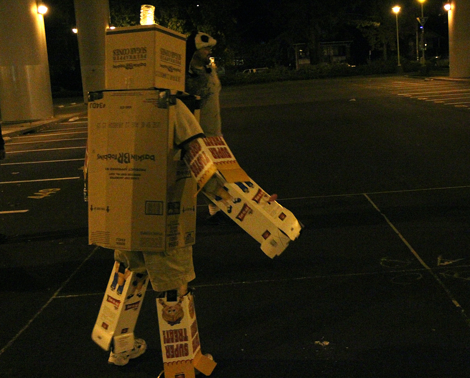 Costume: Full body robot suit made out of ice cream cone boxes. Small pink spoons as “hands,” small rectangular window for vision. “I was at work and there were boxes. And it was free,” said a muffled voice from inside the cardboard helmet.