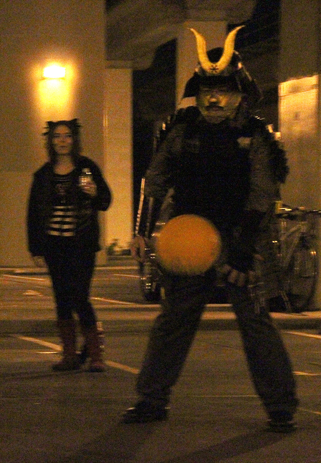 Around 11:30 pm, one man dressed as a BART police officer drove by in an exact replica of a BART police car. “Hide your beers. Police!” cardboard samurai Wong said between bites of pizza. The car circled the squares and left the parking lot.
