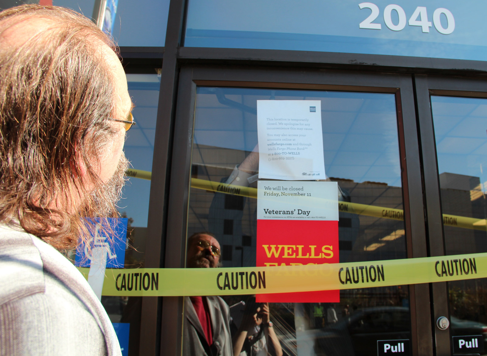 - Mark Phillips, Hayward resident, watches Wells Fargo employee place a sign informing costumers the bank is closed for the day. Phillips and other protesters block the entrance to protest against “banks greed.”