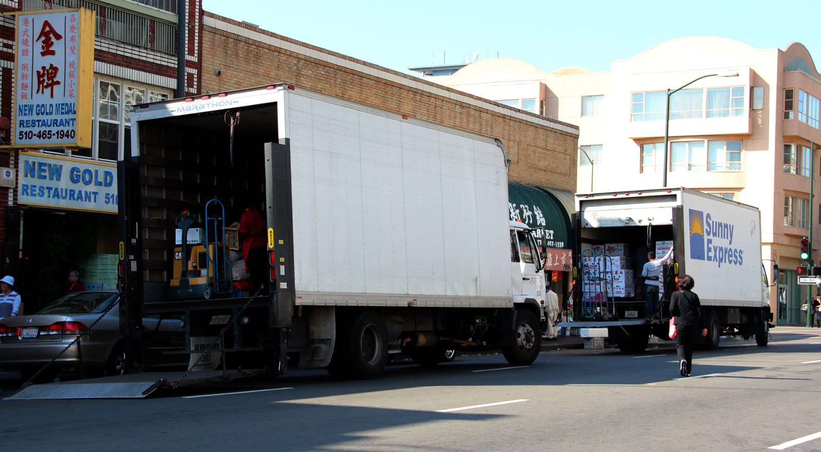 Trucks constantly move through the streets of Chinatown, parking near the curb to deliver shipments of produce and other items.