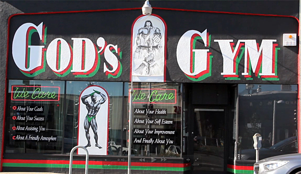 God’s Gym is hard to miss no matter the time of day. The two-story storefront on the corner of Broadway and 25th Street is painted jet black from top to bottom. Images of two posed, flexing bodybuilders fill the front windows. One is a silhouette of Shields in his prime. Centered between the bright, bold white words of the gym’s name is a painting of a buff, black Jesus breaking free of chains.